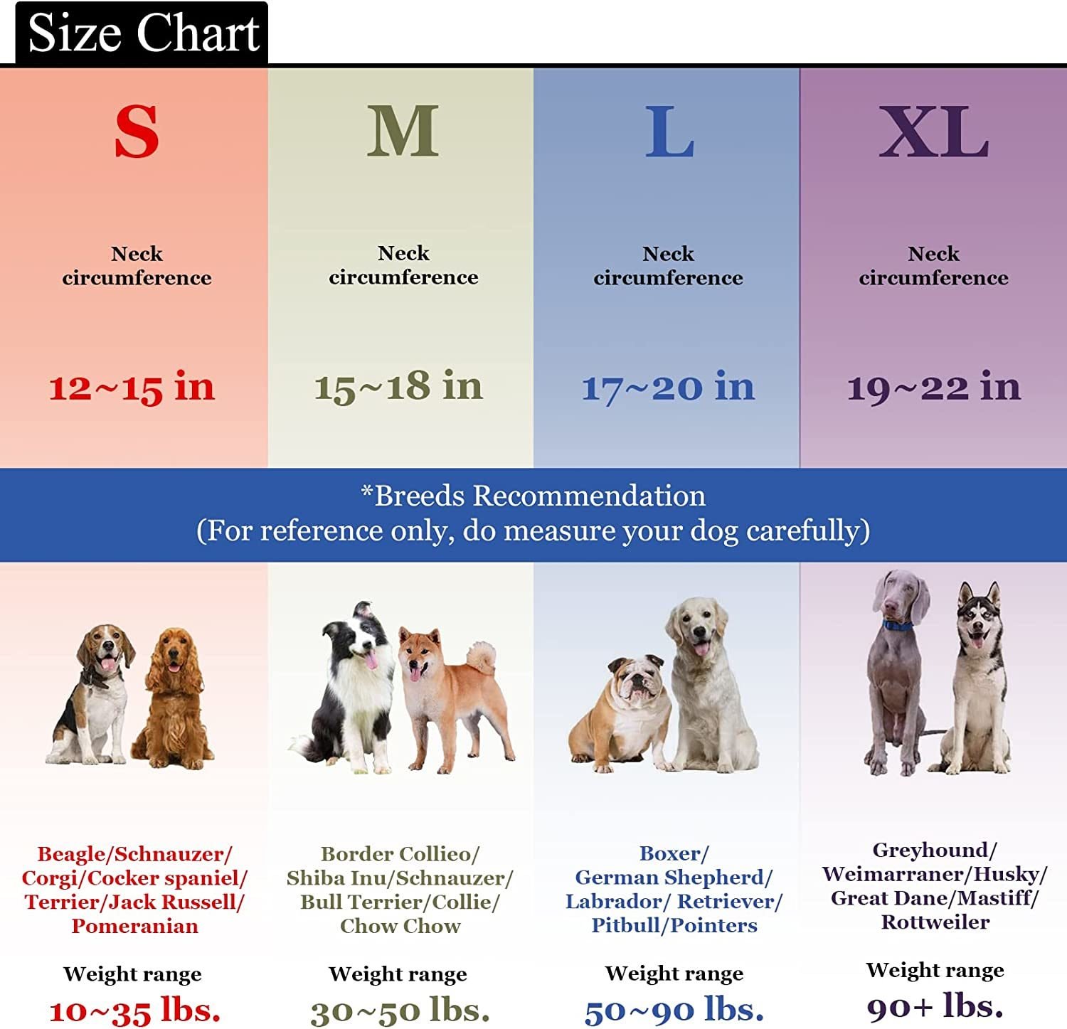 INTEGRATED DESIGN FOR AIRTAG: Are you always wondering where is your dogs or cats? Or are you always trying to find him/her? We're proud to announce our latest AirTag Dog Collar; integrated the AirTag Holder with premium basic Dog Collar. With our AirTag Dog Collar; allows you to keep tracking your beloved ones! (Note: The AirTag is not included) FIRM & COST EFFECTIVE: Bolting with the screw; the built-in leather pocket as Dog AirTag Holder is a perfectly fit and prevents your AirTag to lose or drop from it. 100% firmly combined with the Dog Collar; ensures your Apple AirTag stay connected with your dogs/cats. Plus; you won't need to purchase other detached; easily lost AirTag products. PREMIUM MATERIAL: Designed with premium material; reflective stripe; waterproof webbing and strict stitching ; our Air Tag Dog Collar is also featured with soft neoprene padding; prevent your dog's from any irritation or discomfort. No sharp edges or unfold sewing join; and sturdy premium plastic buckle and alloy D-ring ensures your dog's safety. PRODUCT FUNTIONS ENGINNERING: Our Air Tag Dog Collar is more convenient to release with the one-hand quick release buckle; and the D-ring provides a secure attachment for your dog leash and hanging accessories. The strong reflective stitching and edges make your dog's easier to be seen in darkness; safer for walking; running or jogging in the wild. MULTIPLE SIZE OPTIONS: The whole package includes: Airtag Dog Collar x1; Screwdriver x1. Our heavy duty Dog Collar comes with 4 colors and 4 sizes; perfect for small; medium and large dogs. Please measure your dog's neck before your purchase. S: 12"-14"; M: 15"-18"; L: 17"-20"; XL: 19"-22". (Neck Circumference in INCHES)