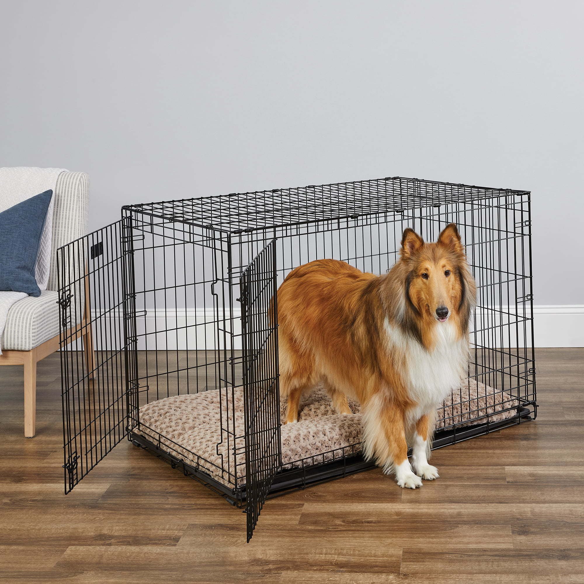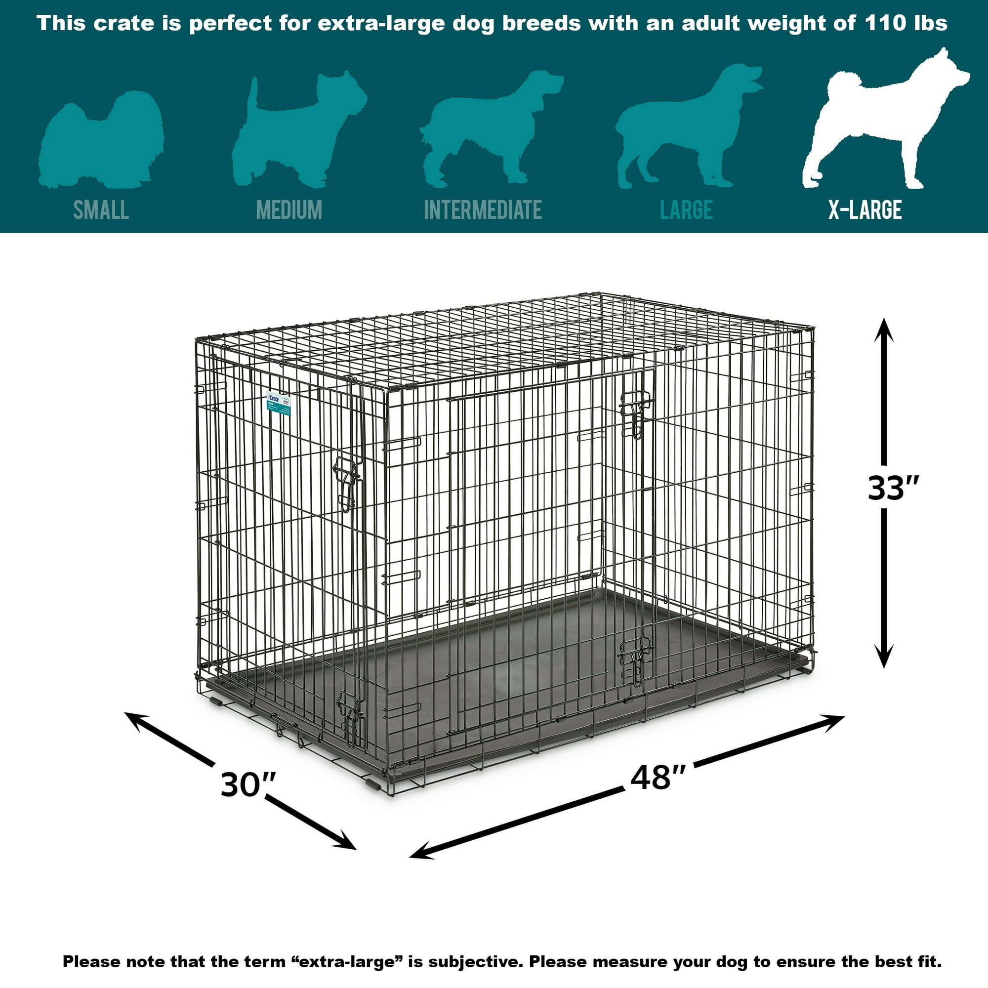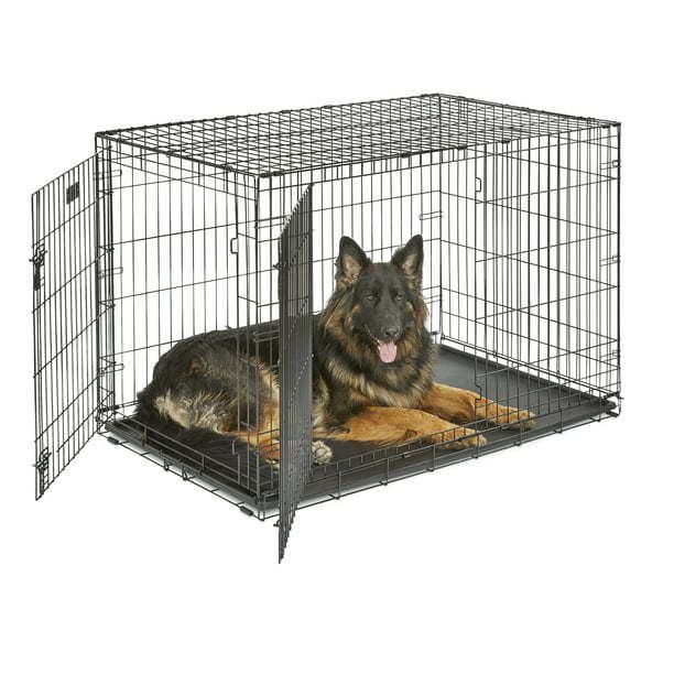 LARGE DOUBLE DOOR FOLDING DOG CRATE: Ideal for dogs adult weight of 71 - 90 pounds. Convenient divider panel allows crate to expand as your dog grows
