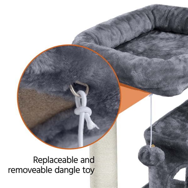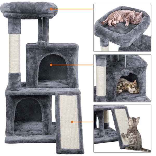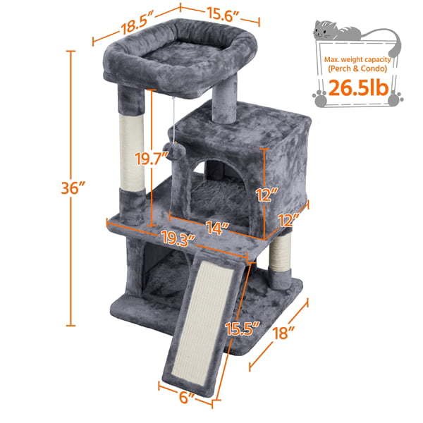 This cat tree is a great playground and comfortable bed for your furry friends. There is a higher perch with raised cushion edges for feline friends to rest and lounge. The dual condos create a sense of security and a quiet place for them to snooze and sleep. Each condo has two doors, convenient for them to come and go. Three fully-wrapped scratching posts are designed pals to play and exercise their paws. The scratching posts help protect your furniture from sharp claws. Durable particleboard, natural sisal ropes, and cozy plush materials make sure that our luxury cat house has a long service life. To ensure safety, the corners of the bottom board, middle board, perch, and condos all are round in shape to protect your cats. Also, in the back of the middle board, there is an anti-toppling band that can be used for securing the cat tree to the wall safely.Material: Particleboard, Plush, Sisal Rope, Metal, Paper Tube, and PlasticColors: Dark GreyOverall size: 49 x 45.5 x 91cm/19.3 x 18 x 36inch (L x W x H)Edged perch: 47 x 39.5 x 9cm/18.5 x 15.6 x 3.5inch (L x W x Thickness)Condo size (ea.): 35 x 30 x 30.5cm/14 x 12 x 12inch (L x W x H)Door size: 18 x 23cm/7 x 9inch (L x H)Scratching board size: 39 x 15.5 x 1.7cm/15.4 x 6 x 0.7inch (L x W x Thickness)Scratching post length: 50cm/19.7inch 30cm/12inchBottom board size: 49 x 45.5 x 1.3cm/19.3 x 18 x 0.5inch (L x W x Thickness)N. W.: 11.1kg/24.5lbG. W.: 12.1kg/26.7lbMax. weight capacity (Perch, Condo): 12kg/26.5lbEasy assembly: We have illustrated instructions and matching accessories included in the package. Also, for your convenience, we have an electronic edition of the assembly instructions. You can scan the QR code in the instructions for E-manual.