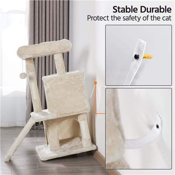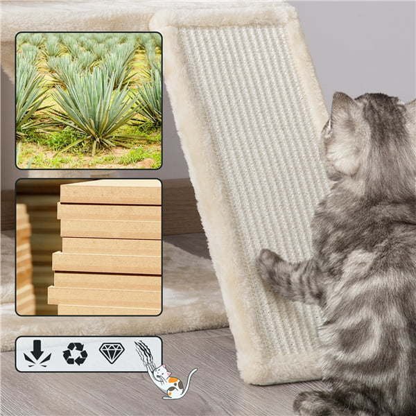 This cat tree is a great playground and comfortable bed for your furry friends. There is a higher perch with raised cushion edges for feline friends to rest and lounge. The dual condos create a sense of security and a quiet place for them to snooze and sleep. Each condo has two doors, convenient for them to come and go. Three fully-wrapped scratching posts are designed pals to play and exercise their paws. The scratching posts help protect your furniture from sharp claws. Durable particleboard, natural sisal ropes, and cozy plush materials make sure that our luxury cat house has a long service life. To ensure safety, the corners of the bottom board, middle board, perch, and condos all are round in shape to protect your cats. Also, in the back of the middle board, there is an anti-toppling band that can be used for securing the cat tree to the wall safely.Material: Particleboard, Plush, Sisal Rope, Metal, Paper Tube, and PlasticColors: Dark GreyOverall size: 49 x 45.5 x 91cm/19.3 x 18 x 36inch (L x W x H)Edged perch: 47 x 39.5 x 9cm/18.5 x 15.6 x 3.5inch (L x W x Thickness)Condo size (ea.): 35 x 30 x 30.5cm/14 x 12 x 12inch (L x W x H)Door size: 18 x 23cm/7 x 9inch (L x H)Scratching board size: 39 x 15.5 x 1.7cm/15.4 x 6 x 0.7inch (L x W x Thickness)Scratching post length: 50cm/19.7inch 30cm/12inchBottom board size: 49 x 45.5 x 1.3cm/19.3 x 18 x 0.5inch (L x W x Thickness)N. W.: 11.1kg/24.5lbG. W.: 12.1kg/26.7lbMax. weight capacity (Perch, Condo): 12kg/26.5lbEasy assembly: We have illustrated instructions and matching accessories included in the package. Also, for your convenience, we have an electronic edition of the assembly instructions. You can scan the QR code in the instructions for E-manual.