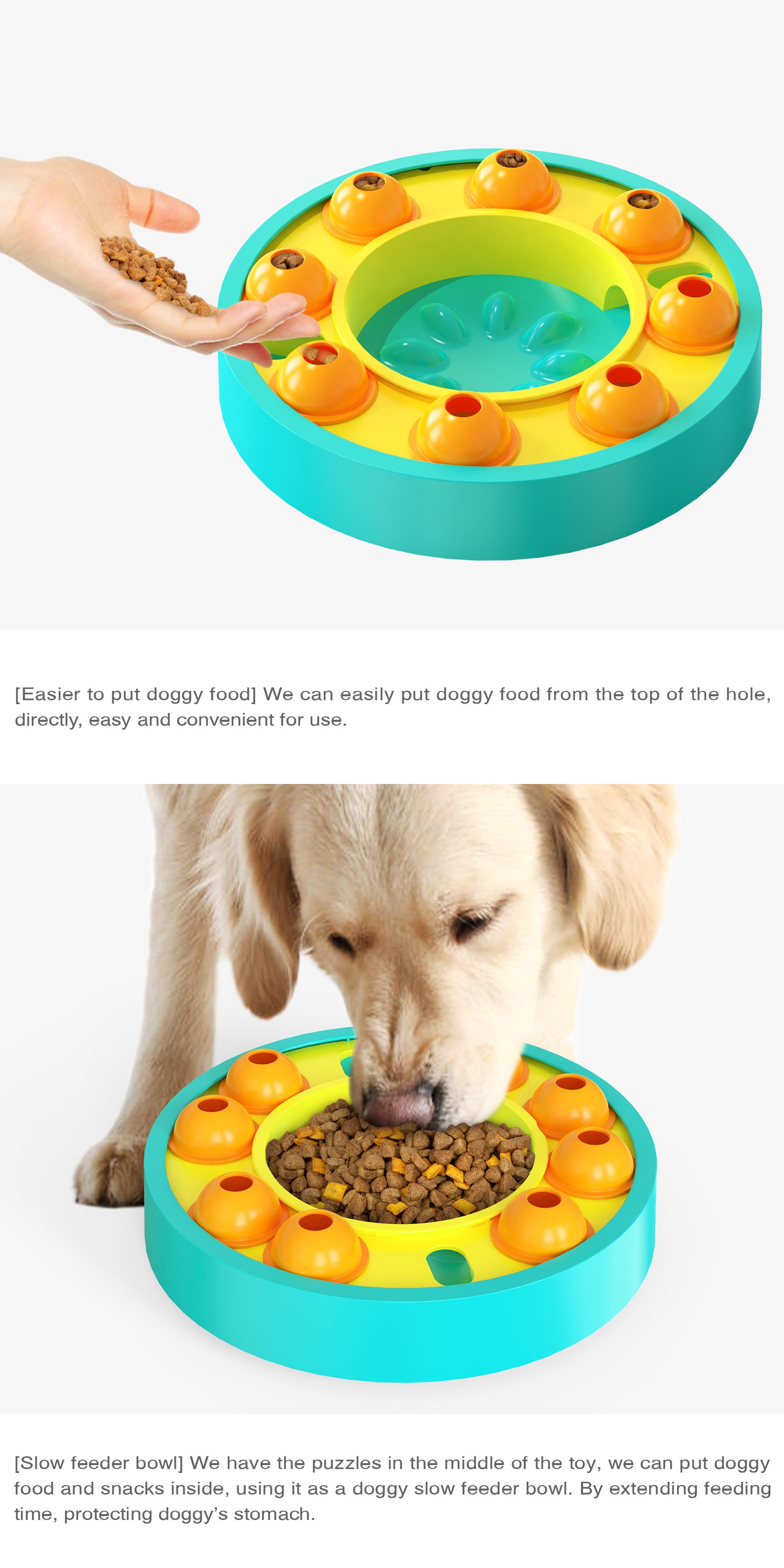 3.It is convenient to add dog food, and the leaking hole on the top can place food, which is easy and convenient to operate