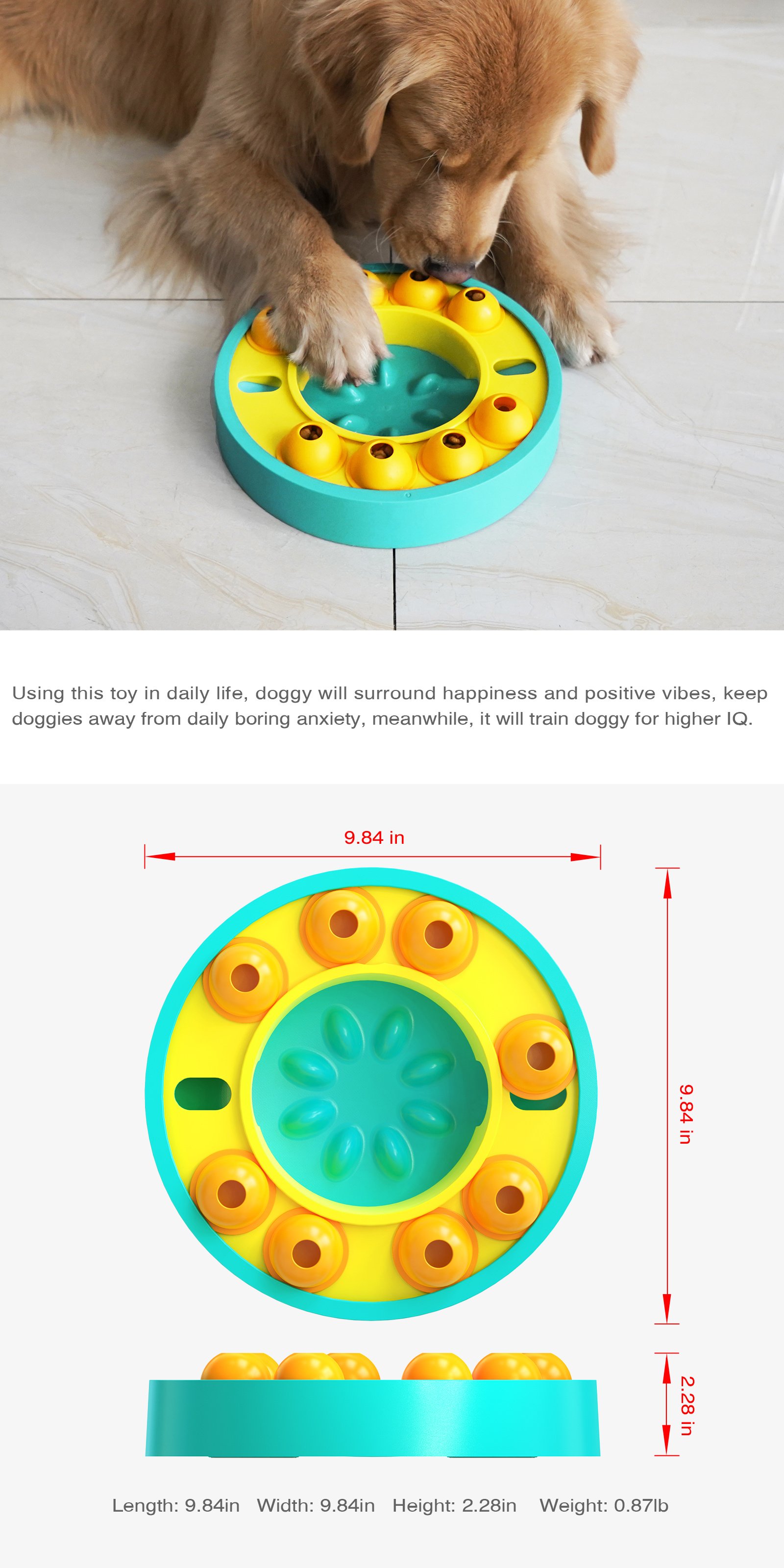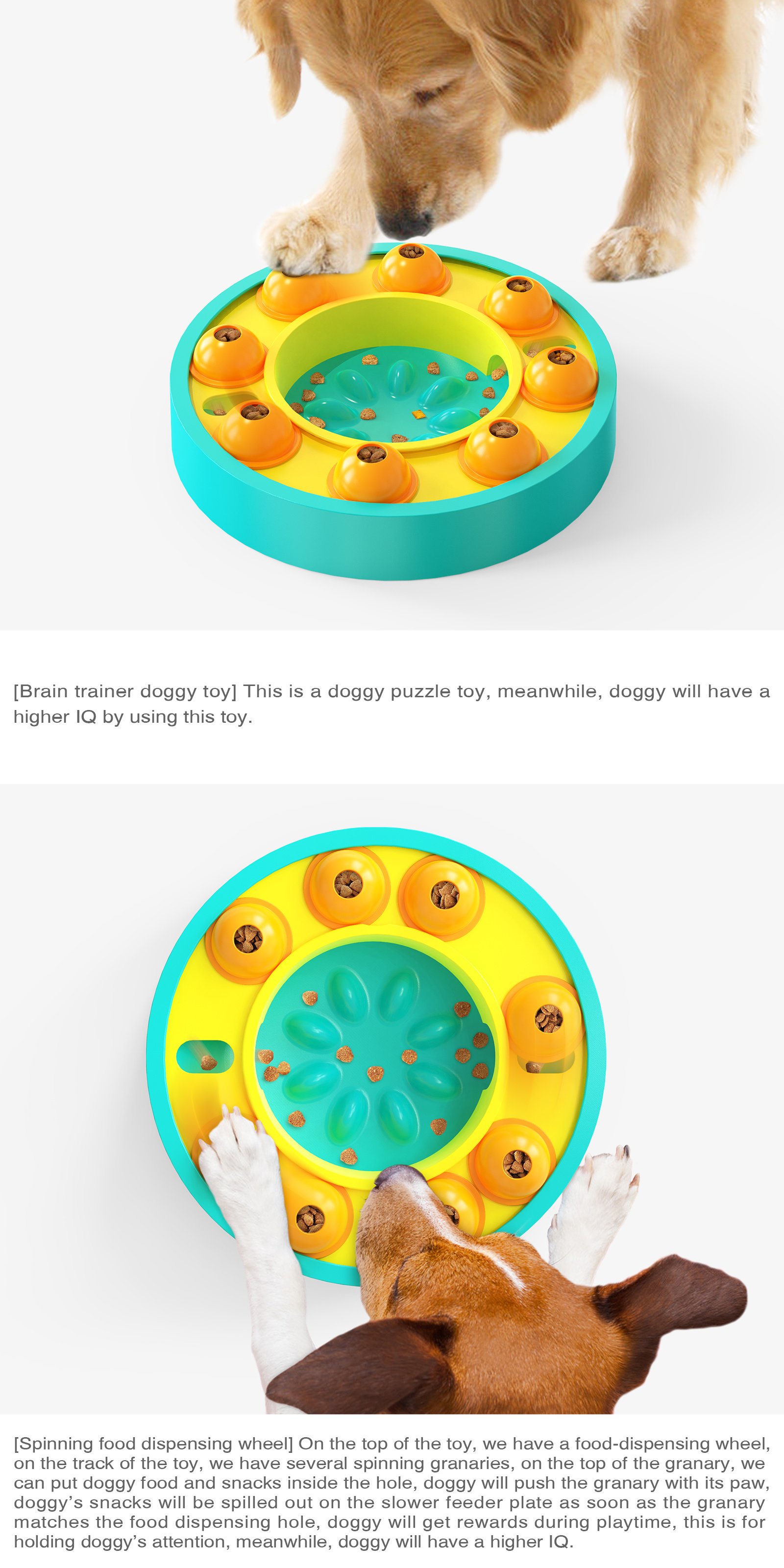 2.The top of thr toy is designed with a leaky turntable. There are several rotatable leaky boxes on the track of the turntable. the hole on the top of the leaky boxes can be put into dog food or snacks. the dog's interest in play an also improve the dog'sintelligence.