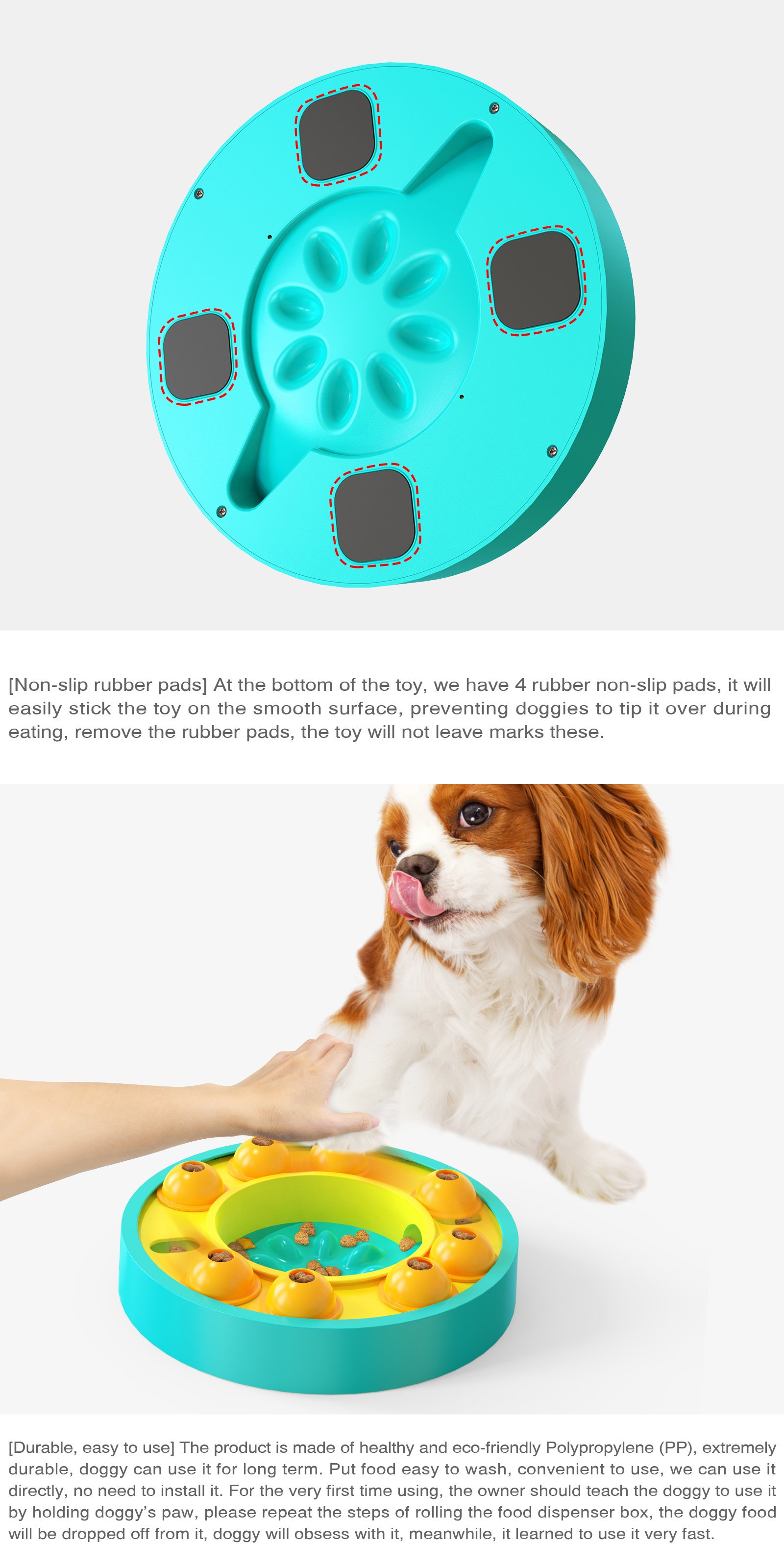 5.The anti-slip rubber pad design can absorb the toy on the smooth ground to prevent the dog from knocking over the toy