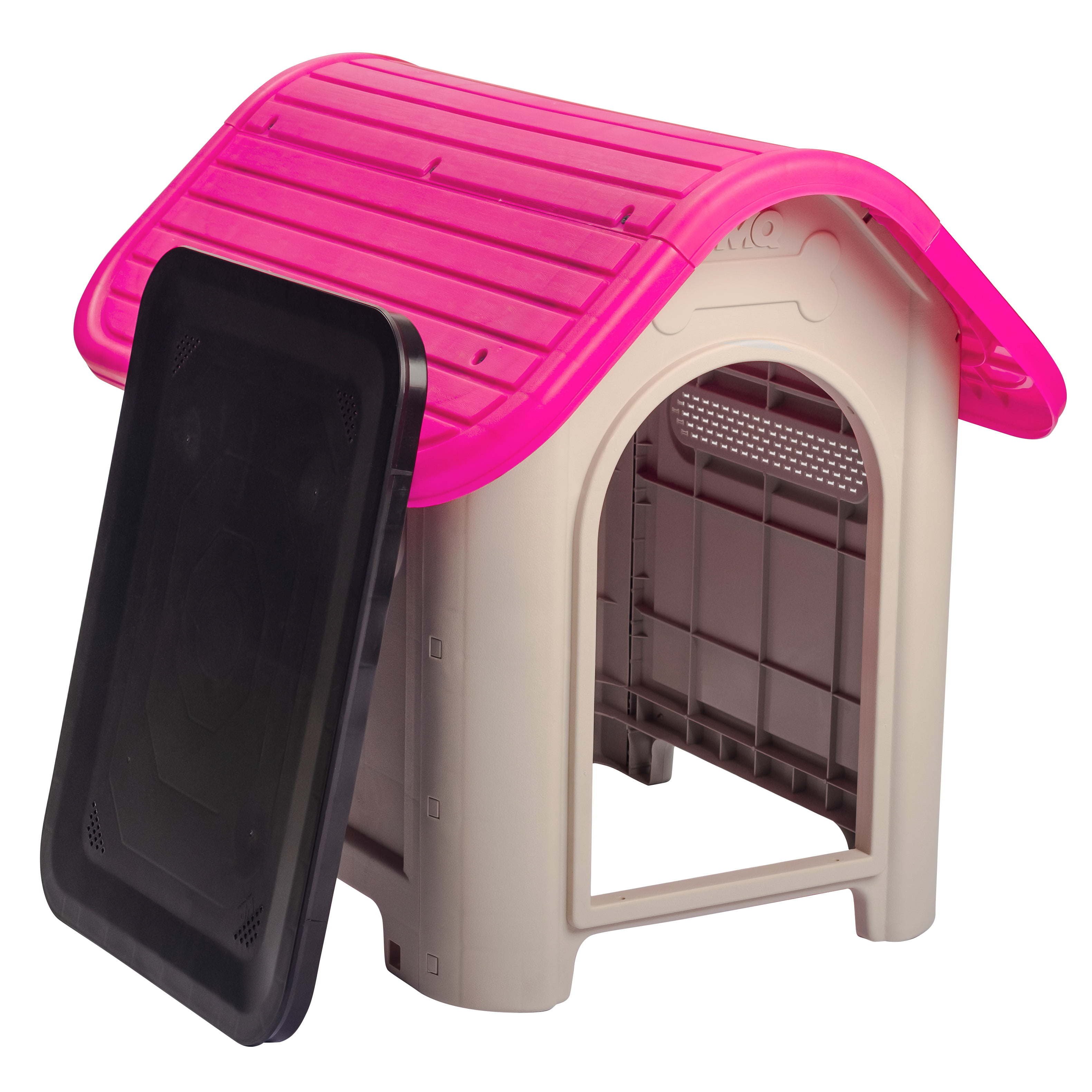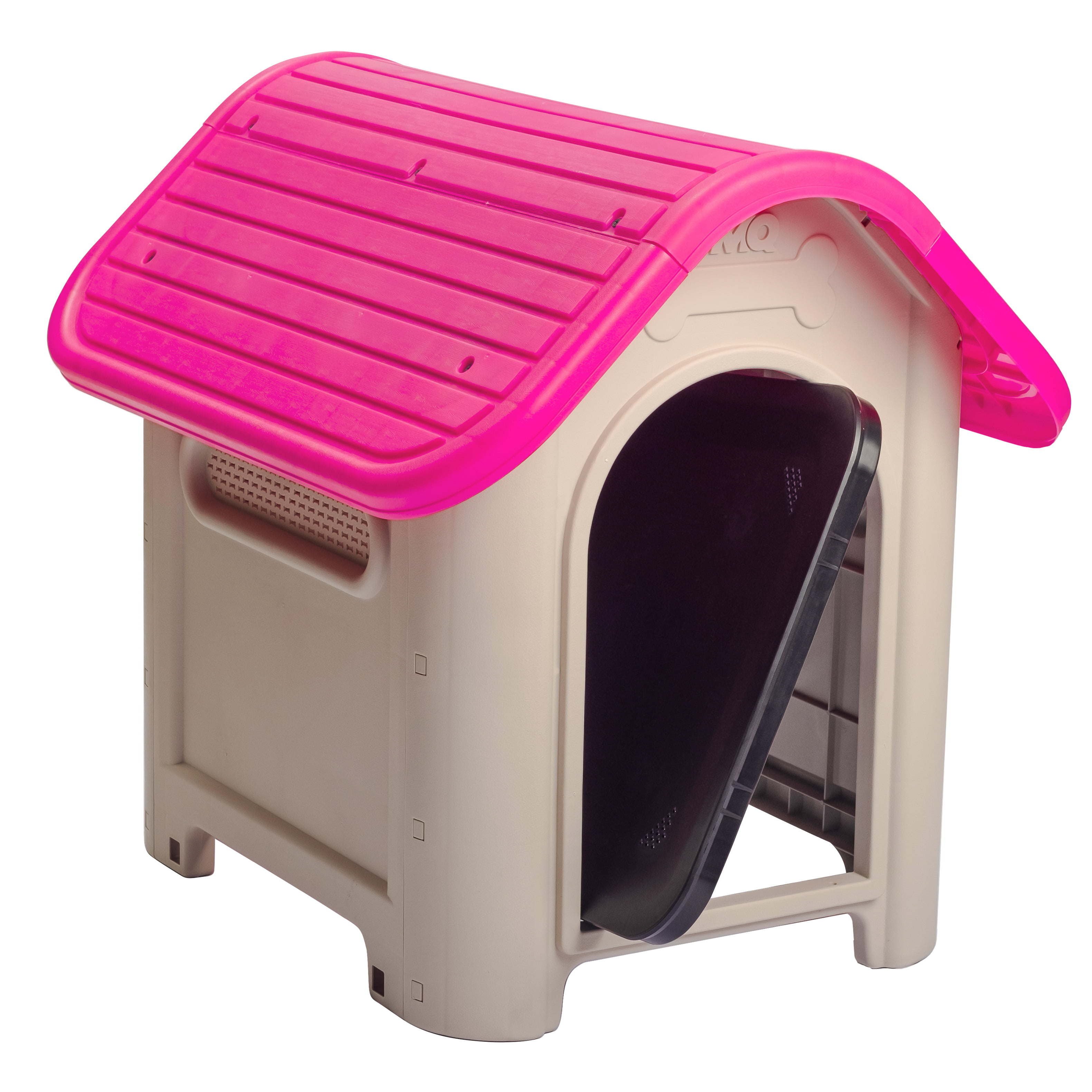 The Dog House includes a matching bowl and is perfect for medium breeds. Its unique floor design allows the floor to be removed for easy cleaning and interior cleaning. Both dog house and bowl are made of durable polypropylene resin that is moisture, rust, stain, and scratch resistant. Construction also features UV protection. The roof design prevents rain or other weather elements from getting inside. Side and rear ventilation allow for maximum pet comfort. An elevated design keeps your dog off the direct ground. The accompanying bowl can be used for water or food. Both dog houses and bowls are perfect for indoor or outdoor use.